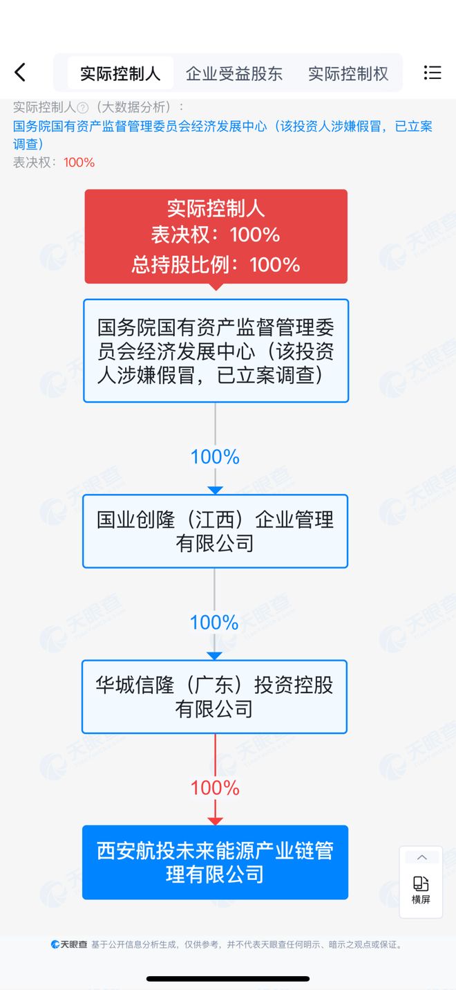 然而,签下百亿级大型投资项目的西安航投未来能源产业链管理有限公司的国企背景疑点重重。据界面新闻,通过股权穿透,其最终指向“国务院国有资产监督管理委员会经济发展中心”,而该机构已被市场监管部门标注为“涉嫌假冒,已立案调查”。